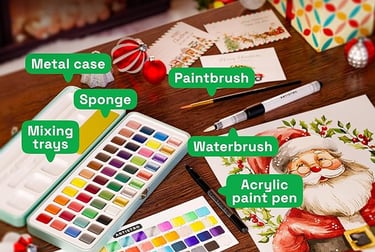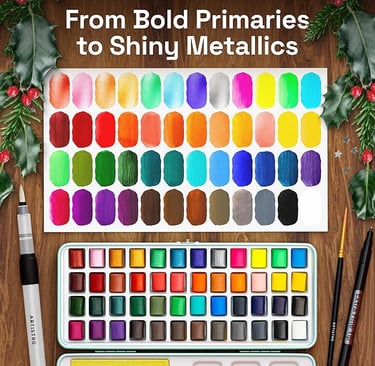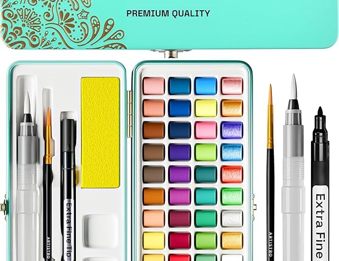 Everything Included: This portable watercolor set comes with 40 water color paints, 4 fluorescent, and 4 metallic colors. The watercolors come with a metal box that has a water brush pen, sponge, black marker, swatch sheet, and flexible brush. Take this kit anywhere!