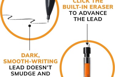 These lead pencils are always ready and never need sharpening; to advance the lead, simply click the built-in eraser