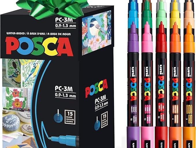 Pack includes 15 POSCA Water-Based Paint Markers with a reversible fine tip (0.9-1.3 mm) featuring blue, brown, white, grey, black, light blue, green, light green, purple, pink, red, orange, bright yellow, yellow, and light orange.