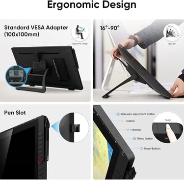 High-Resolution Screen: A large 21.5-inch FHD LCD screen with a 1920 x 1080 resolution, providing clear and detailed visuals for your creative projects. The high resolution ensures sharp, precise lines, Additionally, its FHD resolution supports effective use in dual-screen setups, enhancing your ability to manage and view complex content across multiple displays.